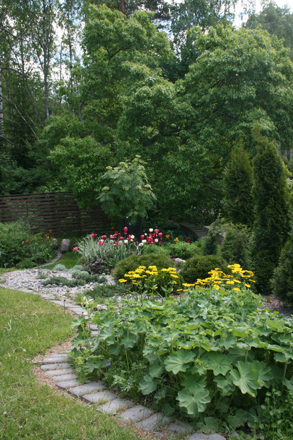 Suuri omakotipiha kaipasi päivitystä ja uusia ideoita. Näkösuojaa oleskeluterassin suuntaan ei ollut riittävästi ja istutusalueet olivat vuosien saatossa kasvaneet jo osittain tukkoon. Haaveena oli myös hyötytarha, jossa voisi yrttien ja mansikoiden lisäksi kasvattaa perunoitakin. Toivomuksena oli myös, että tavoitteisiin päästäisiin kohtuullisella panostuksella vanhaa mahdollisimman paljon säästäen ja kunnioittaen. Olemassa olevat kasvit ja tontin muodot antoivat suunnitelmalle raamit. Kasveja valittaessa huomioitiin erityisesti, että kaunista katseltavaa riittäisi kaikille vuodenajoille. Talon suurista ikkunoista avautui pitkin vuotta ilmettään vaihtava maisemataulu.